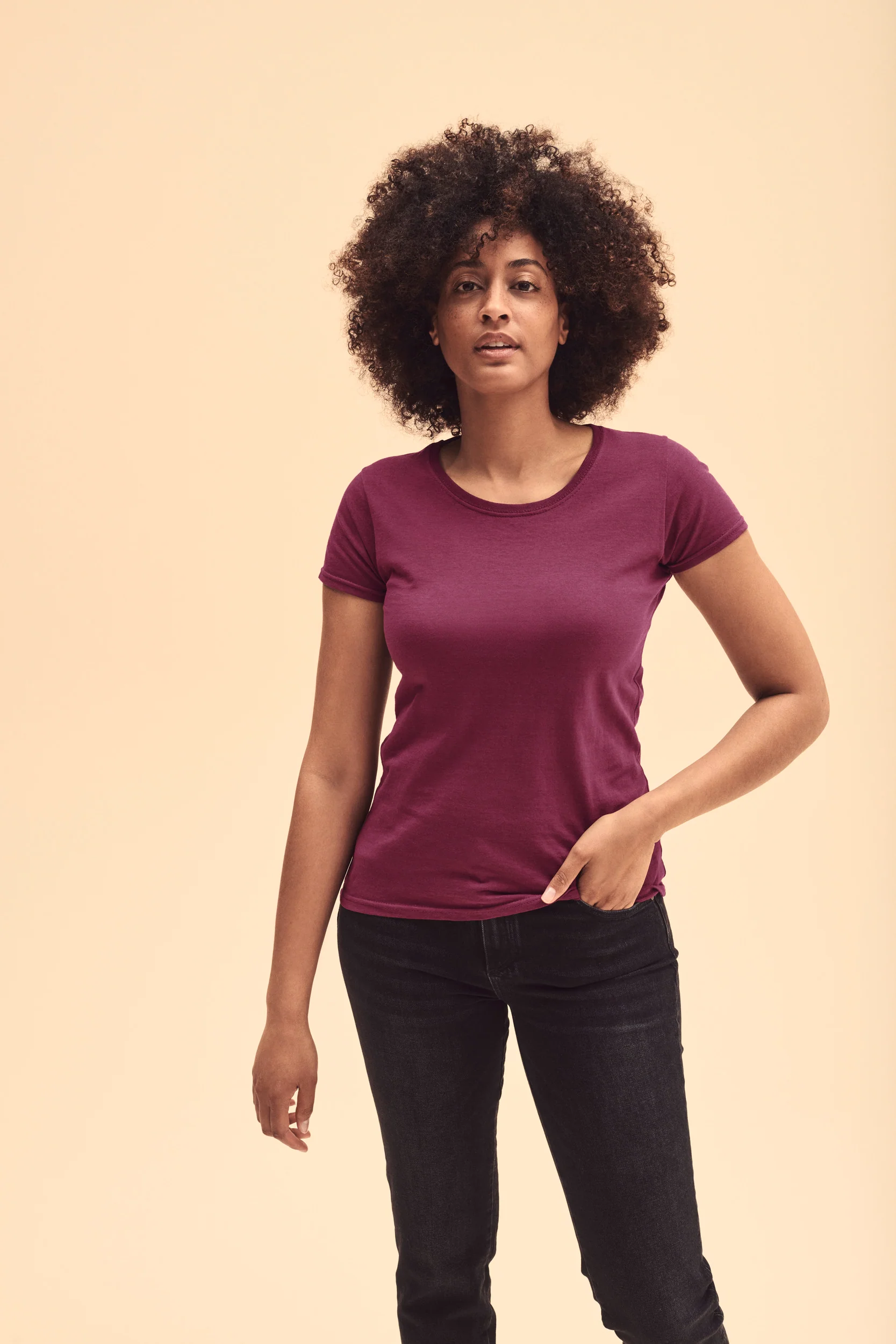 100% cotone (Heather Grey : 97% cotone / 3% poliestere). Collo in costina con nastrino dello stesso tessuto. Cuciture laterali sagomate per un taglio femminile. Certificato STANDARD 100 by OEKO-TEX®N° 08-5295, Shirley.