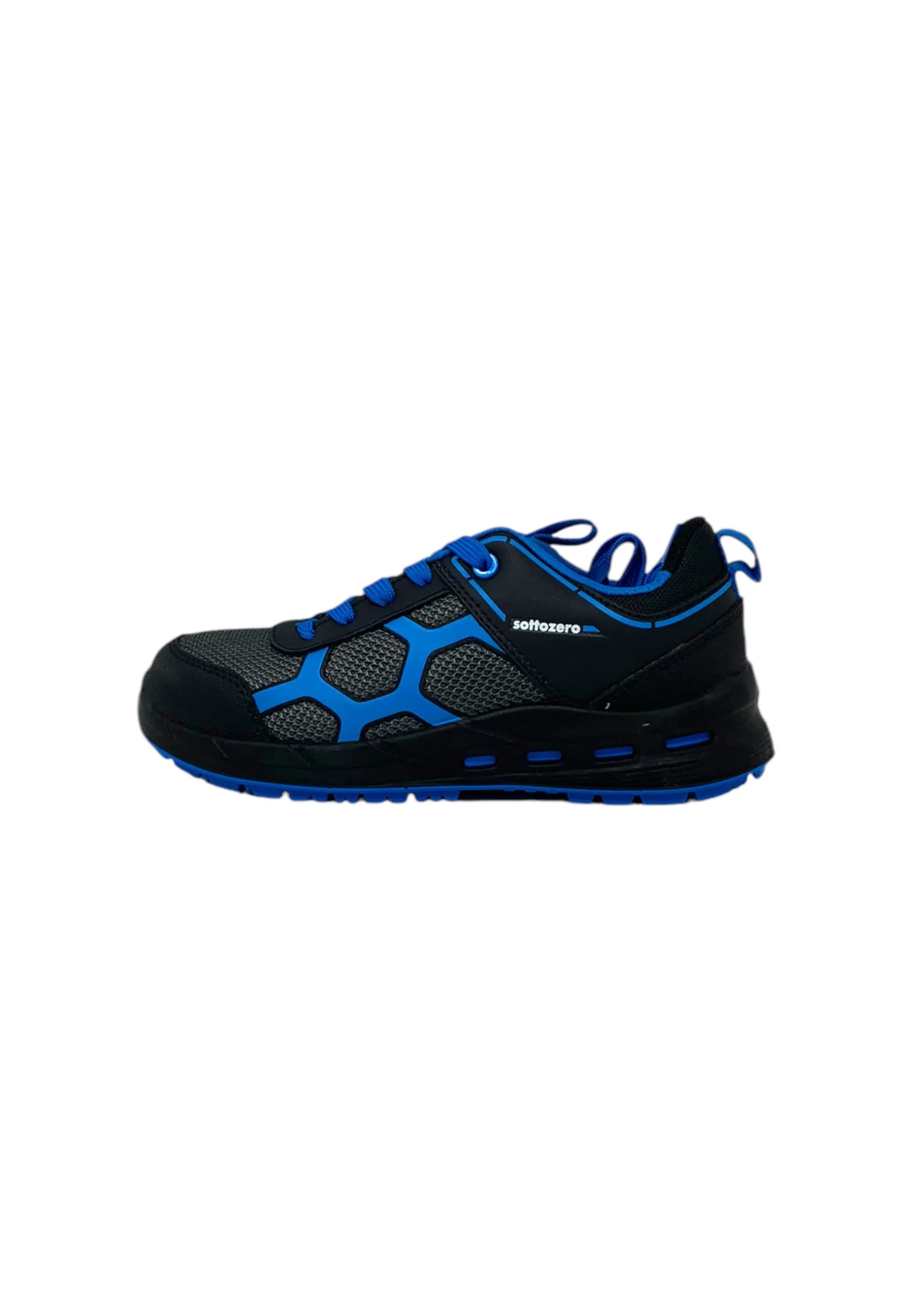 Scarpe antinfortunistiche Sottozero della linea crystal ufo blu, con tomaia in ecopelle e nylon in mircrofribra, fodera in tessuto, puntale in fibra di vetro, suola PU/PU, sottopiede antiperforazione e traspirante.