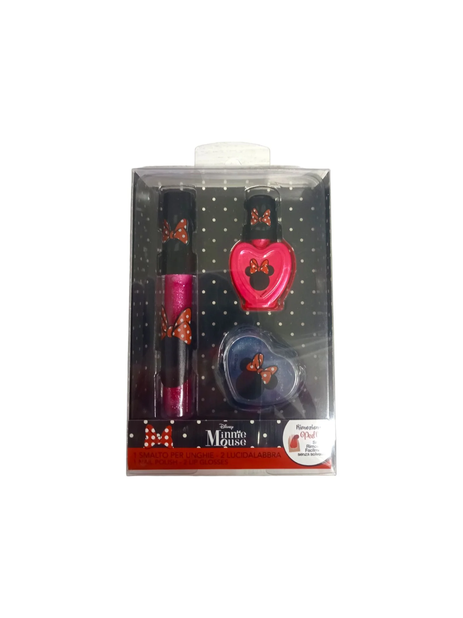 Set regalo ispirato al personaggio Minnie Mouse, contiene due lucidalabbra e uno smalto. Questo set è un’ottima scelta per tutte le bambine che amano il trucco.