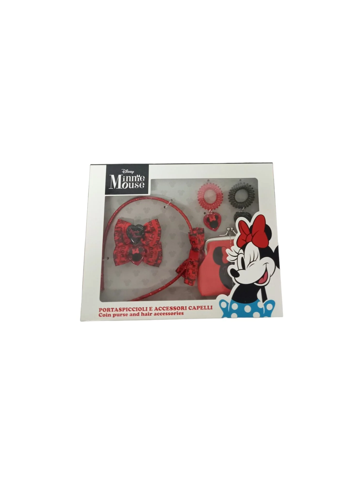 Set regalo ispirato al personaggio Minnie Mouse, contiene un portaspiccioli, 1 cerchietto per capelli, 2 elastici spirale e 2 mollittine click clack.