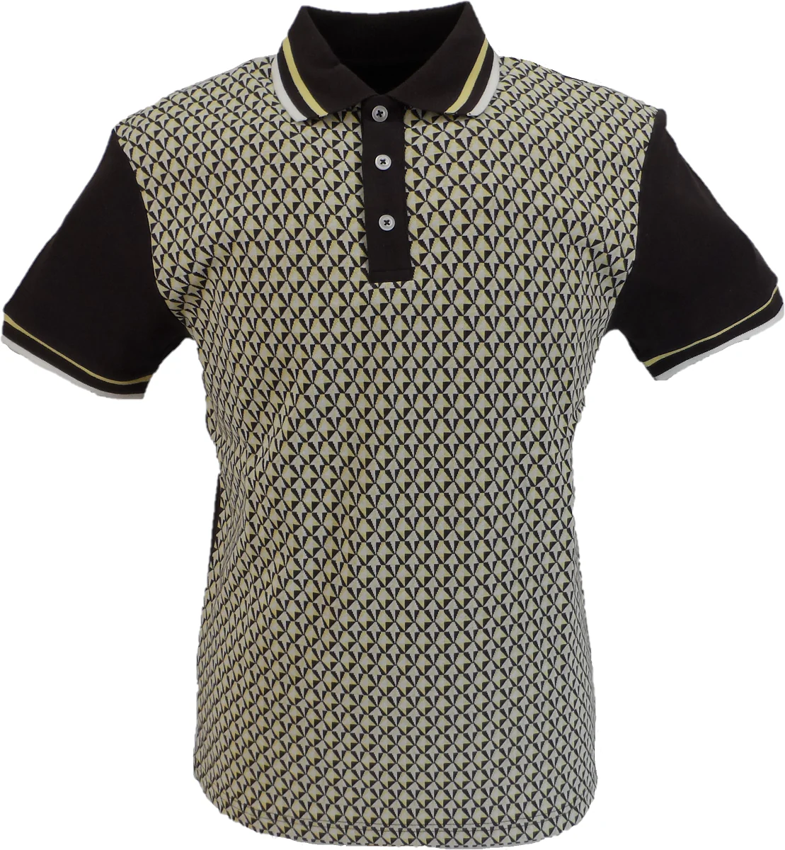 Heavy cotton interlock knit shirt, with jacquard geometric panel front, with two-colour tipping detail to collar and cuffs and three button placket. No exterior branding. Crafted from pure Cotton.