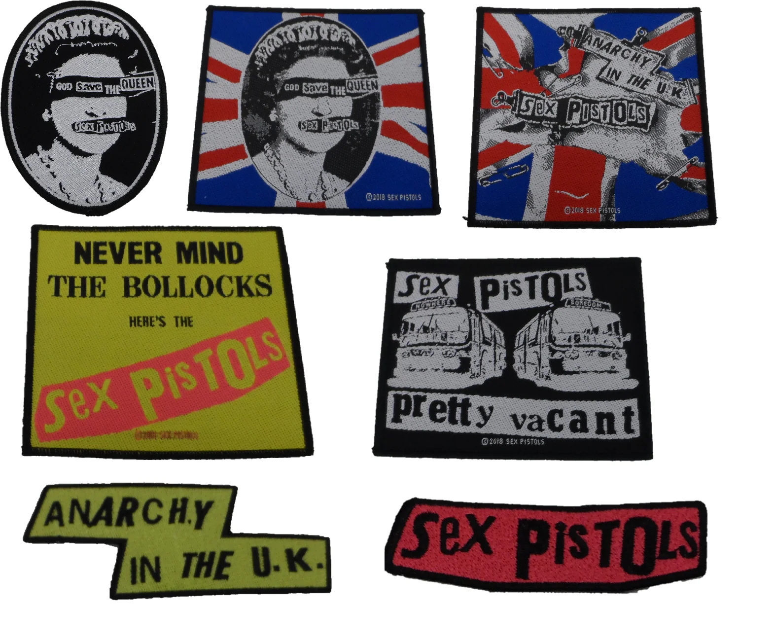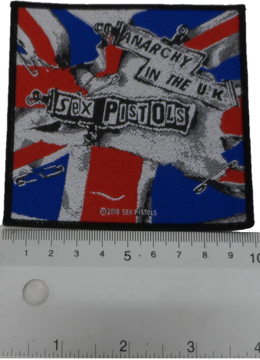 | Design | Anarchy in the UK 10 cm, Anarchy Logo 11 CM, God Save The Queen 7 cm, God Save The Queen Union Jack 10 cm, Never Mind the Bollocks 10 CM, Pretty Vacant 10 Cm, Standard Logo 9 cm |