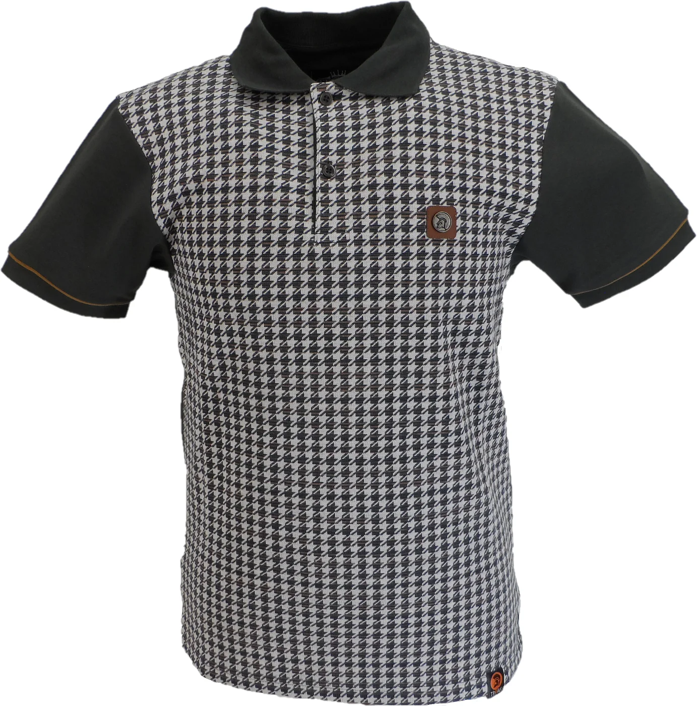 This Trojan mens polo shirt features a heavy cotton interlock fabric with a houndstooth jacquard panel on the front for a distinctive look. It has a classic two-button placket, detailed piping on the cuffs, and is finished with a metal Trojan helmet badge on the chest and a woven label on the hem for added style.