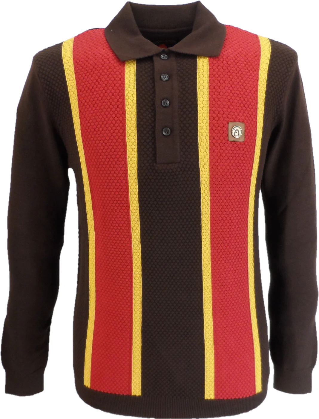 Cotton fine gauge polo, with four button placket, with textured stripes on front panel, with Trojan metal badge to chest.