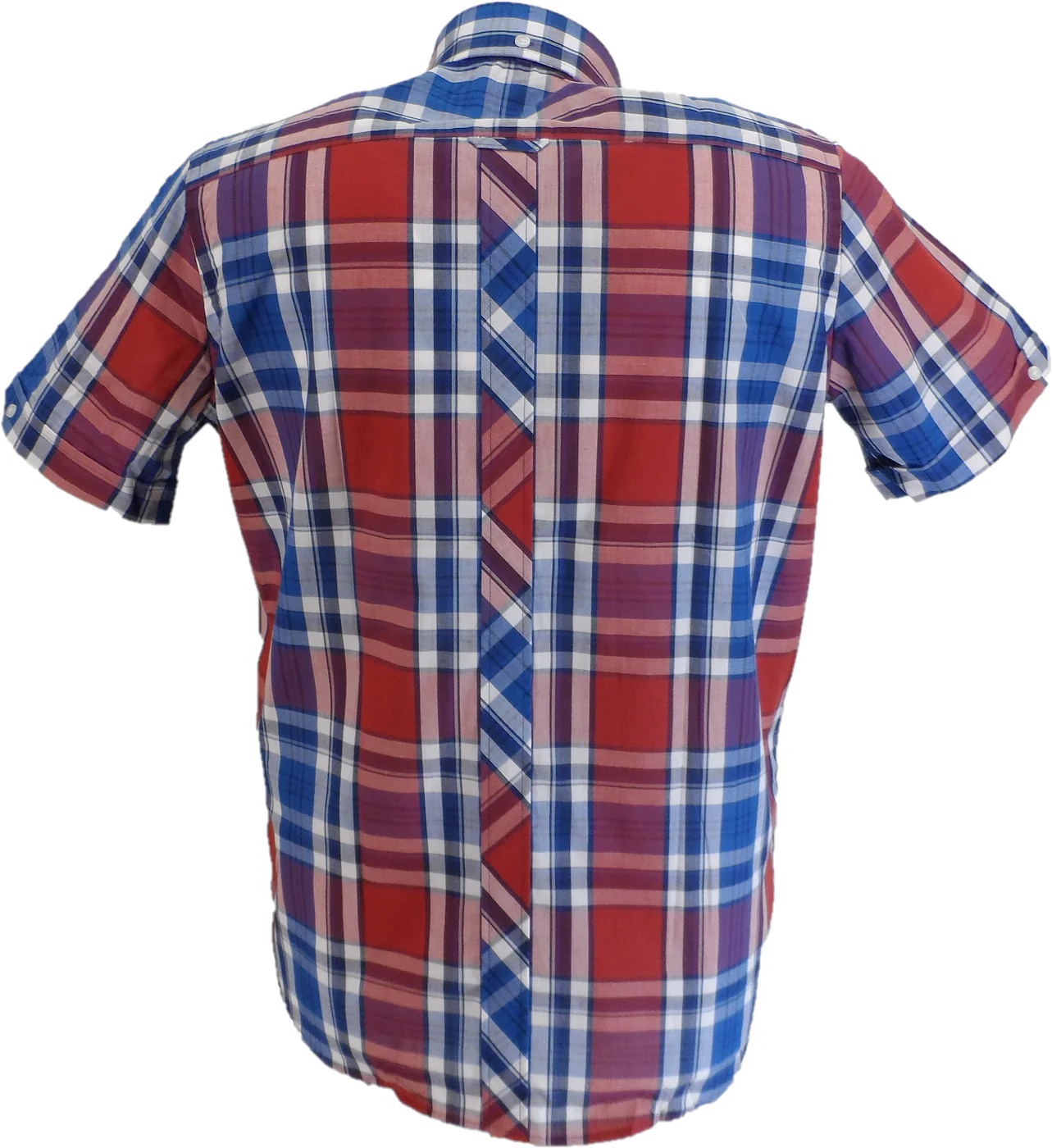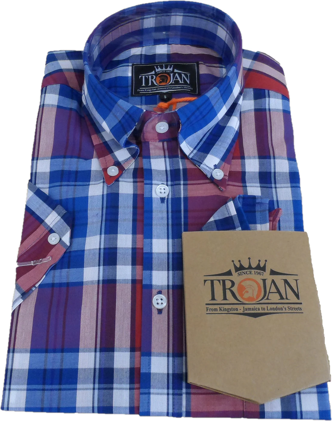 Pure Cotton Tartan check button-down shirt, with 3-finger, roll button-down collar, chest pocket (with ‘Trojan’ tab label), short sleeve with v-insert/double button detail, back collar with button/tab detail and full length back placket with a loop.