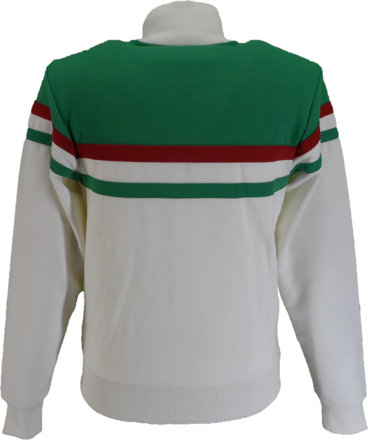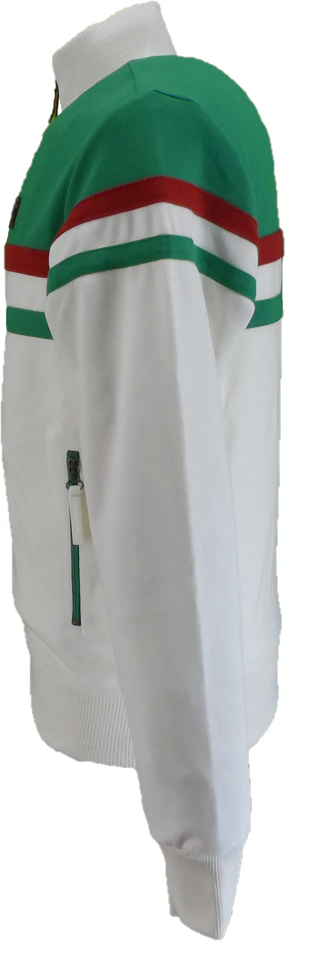 This Trojan retro knit track top features cut-and-sew stripe details across the front, back, and sleeves, highlighted by a contrasting upper panel. Designed with ribbed collar, cuffs, and hem for a snug fit, it includes a contrasting zip front and zippered pockets. Finished with a Trojan embossed zip puller and a metal Trojan badge on the chest, this track top combines style and functionality effortlessly.