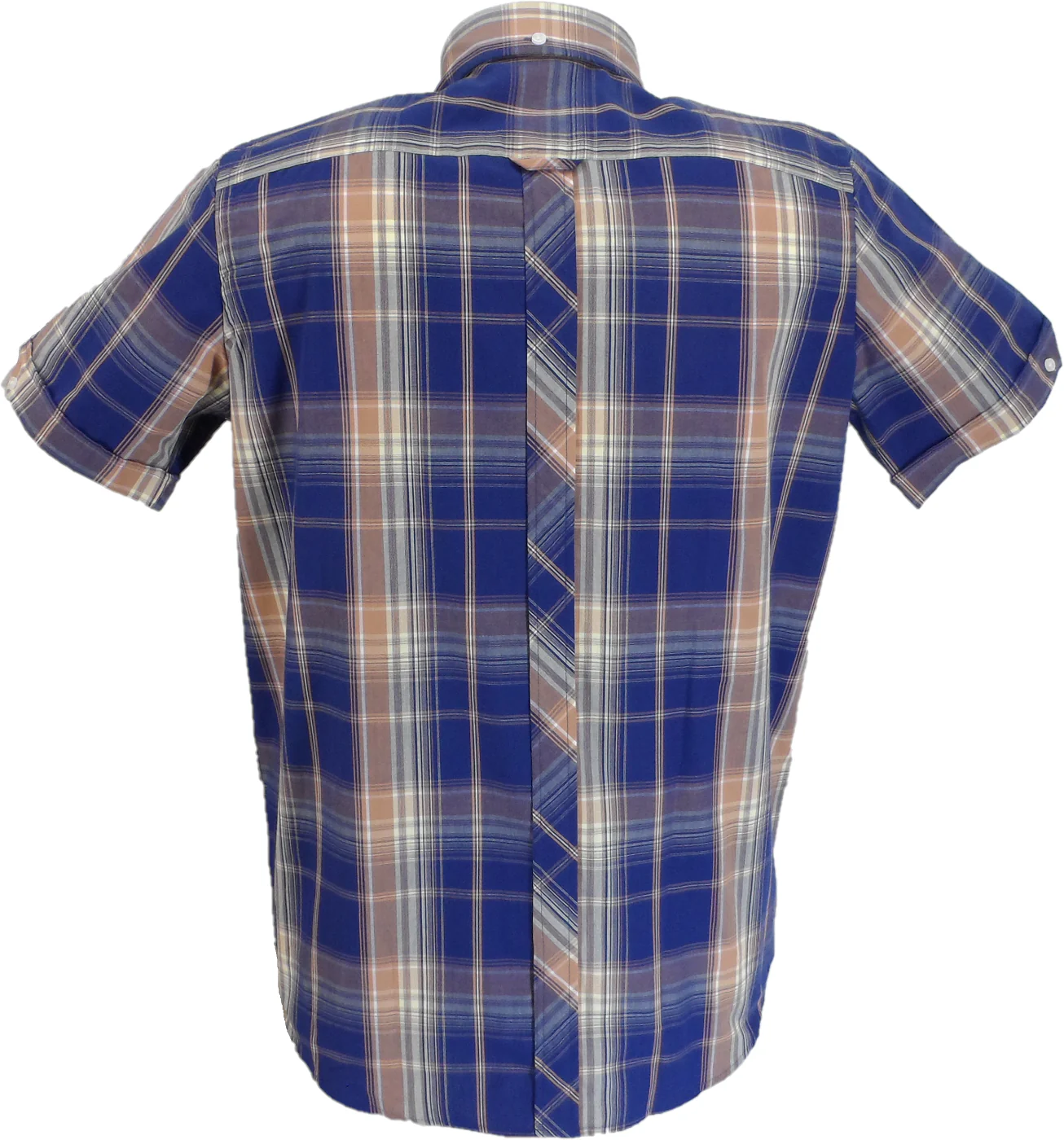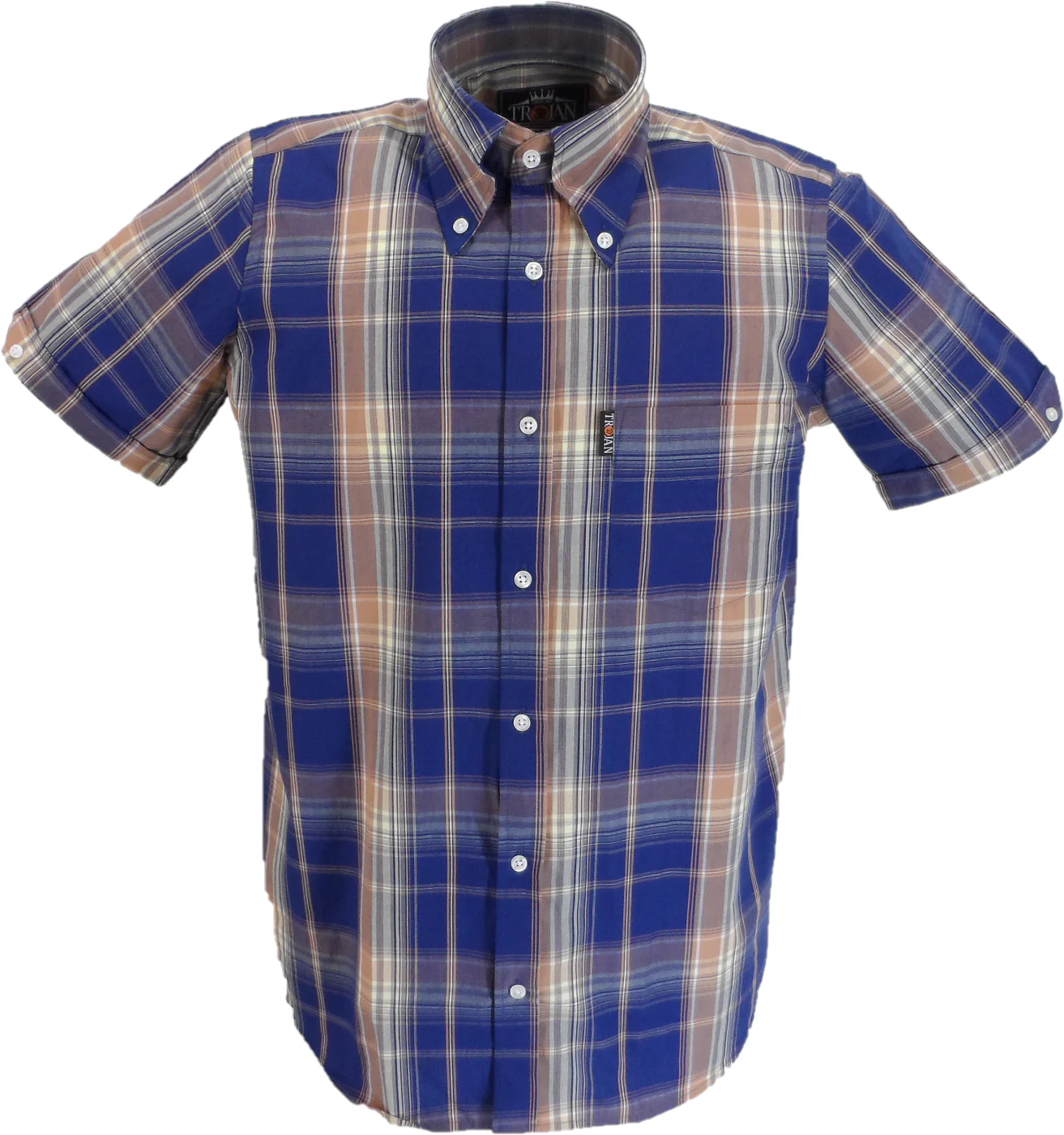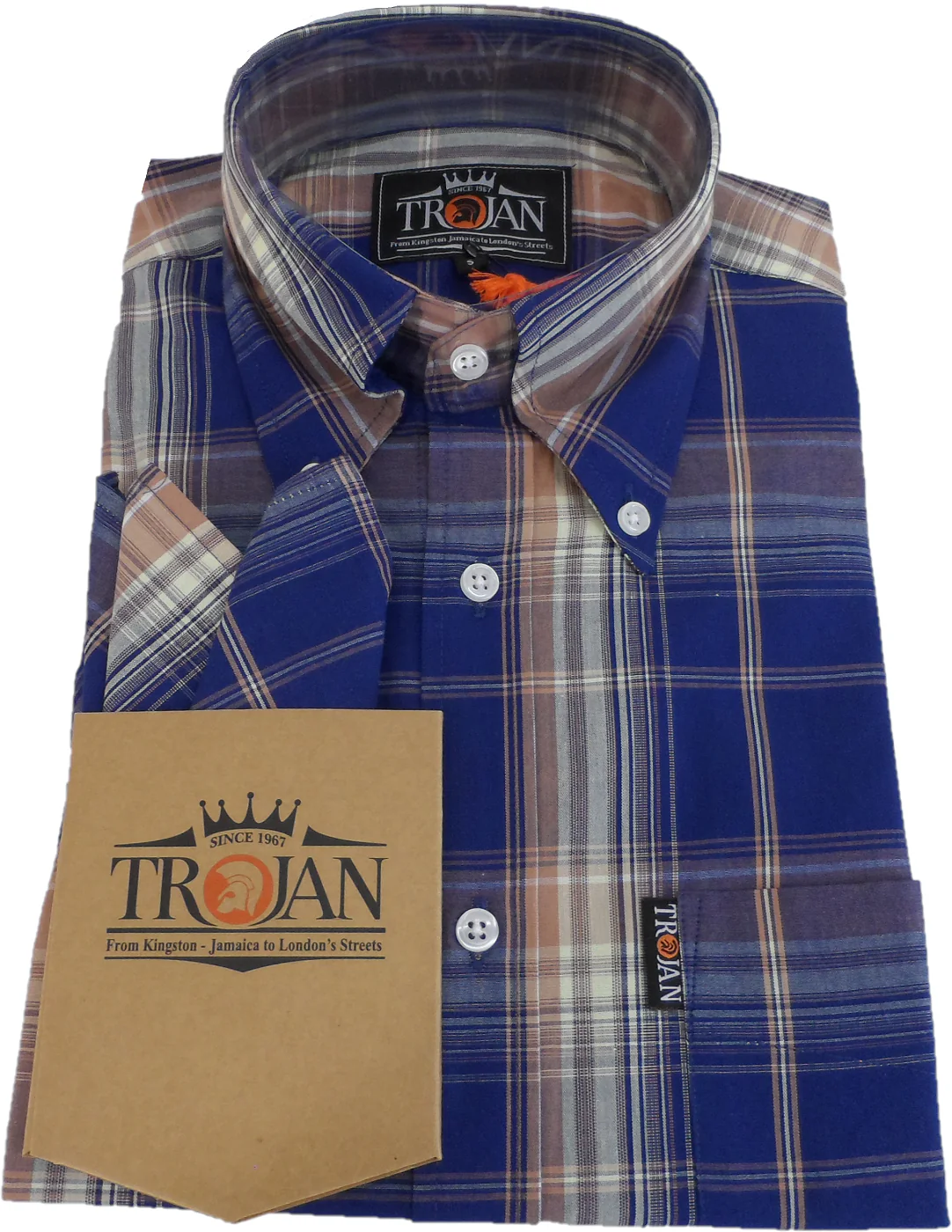 Pure Cotton Tartan check button-down shirt, with 3-finger, roll button-down collar, chest pocket (with ‘Trojan’ tab label), short sleeve with v-insert/double button detail, back collar with button/tab detail and full length back placket with a loop.