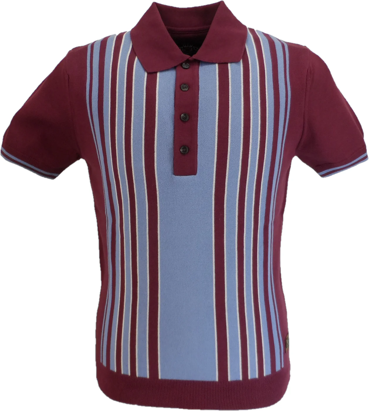 Cotton fine gauge polo, with four button placket, stripes on front panel, and Trojan metal badge to Helm