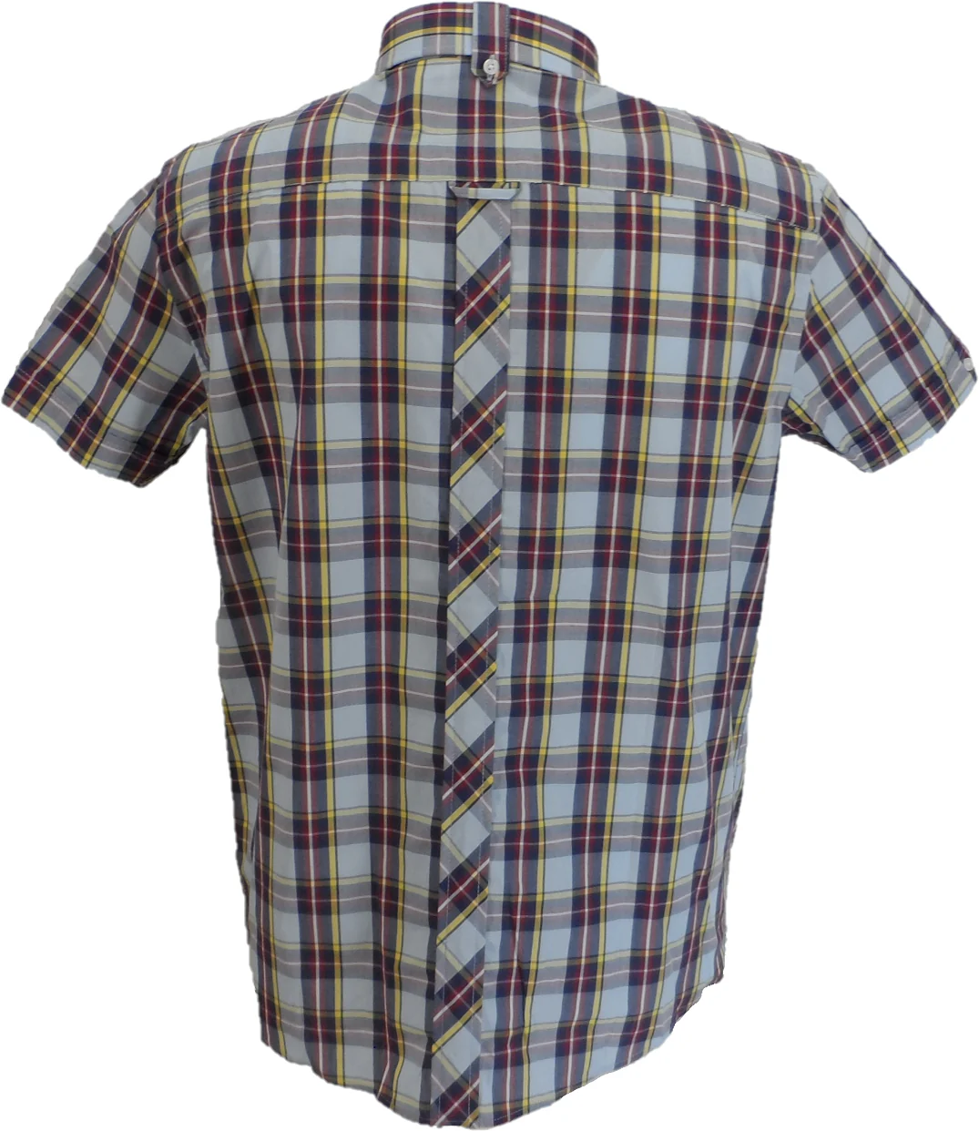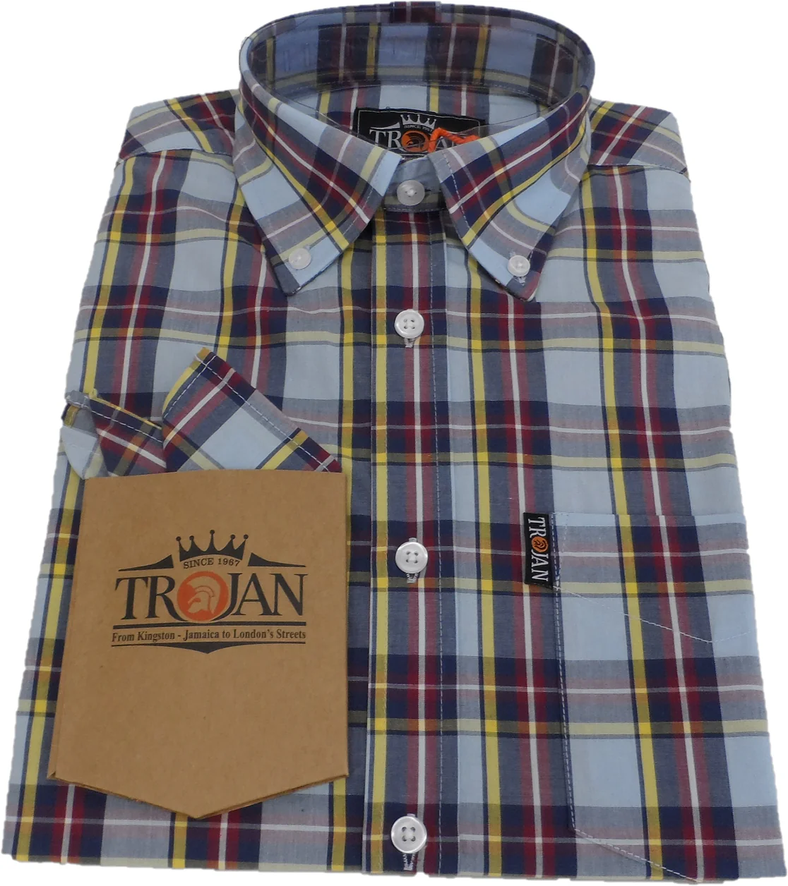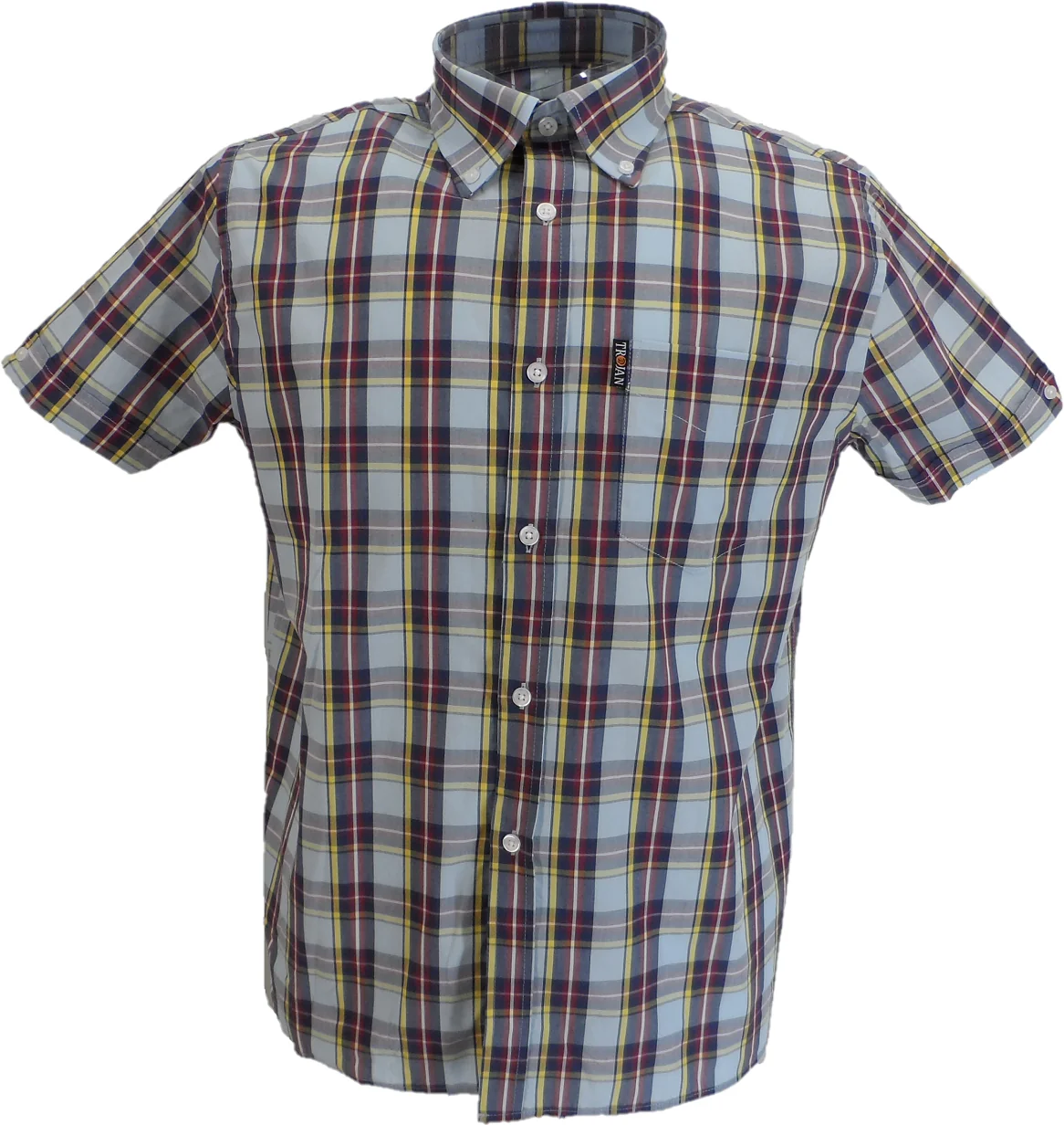 Pure Cotton Tartan check button-down shirt, with 3-finger, roll button-down collar, chest pocket (with ‘Trojan’ tab label), short sleeve with v-insert/double button detail, back collar with button/tab detail and full length back placket with a loop.