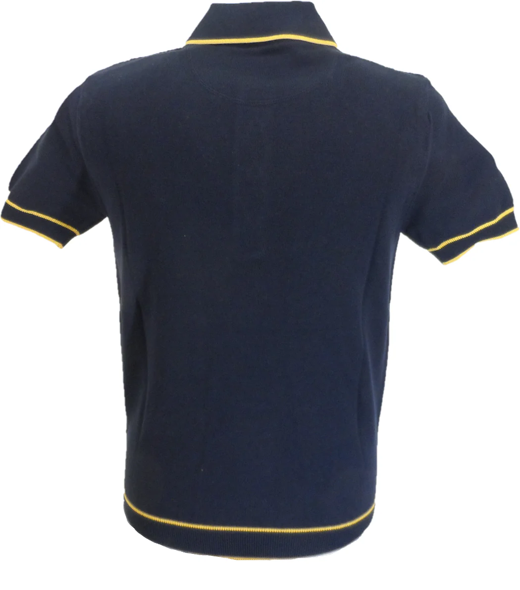 Cotton fine gauge polo, with four button placket, with textured diamond knit on front panel, with tipping on collar, cuffs and hem, with Trojan metal badge to chest.