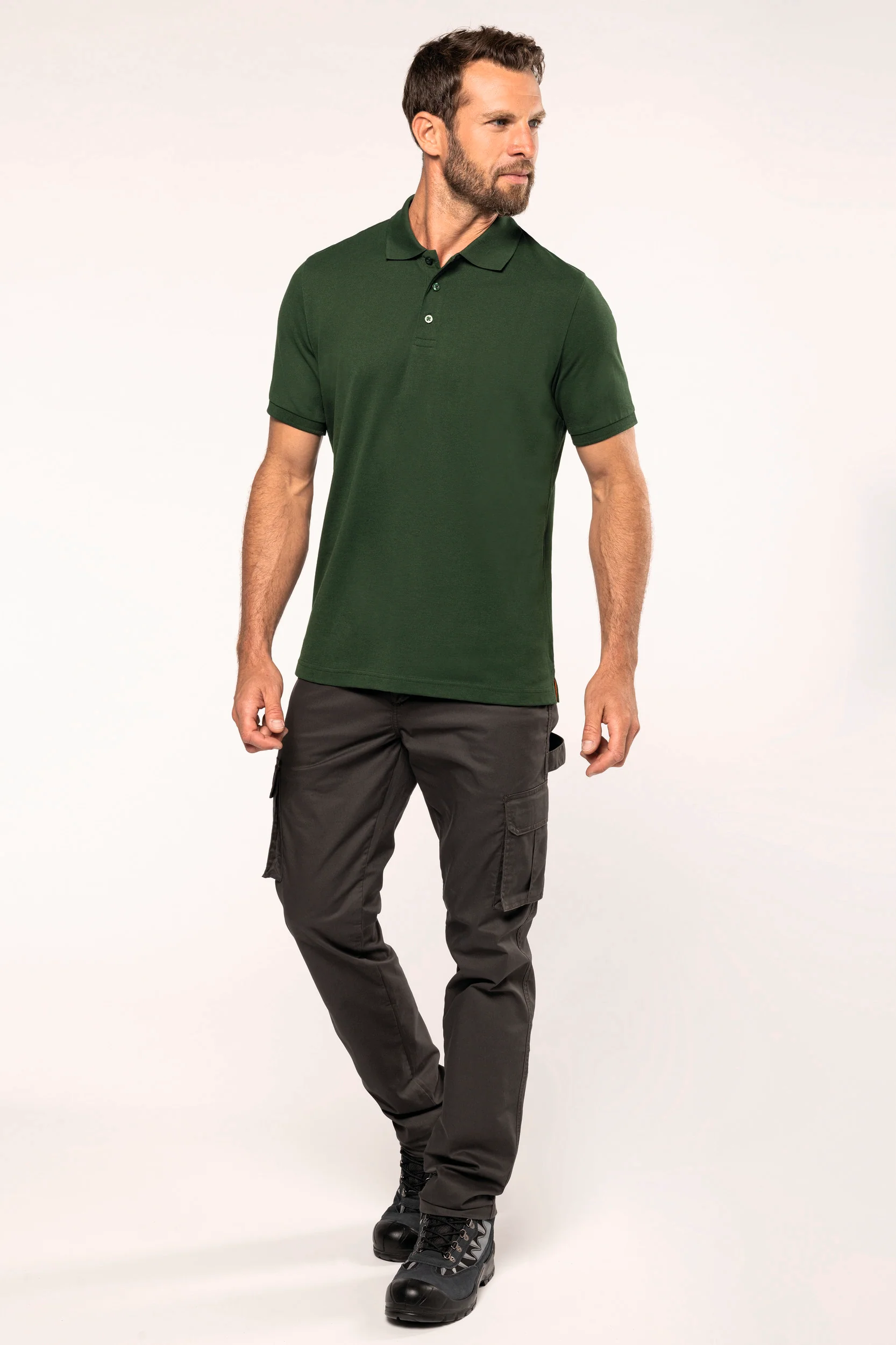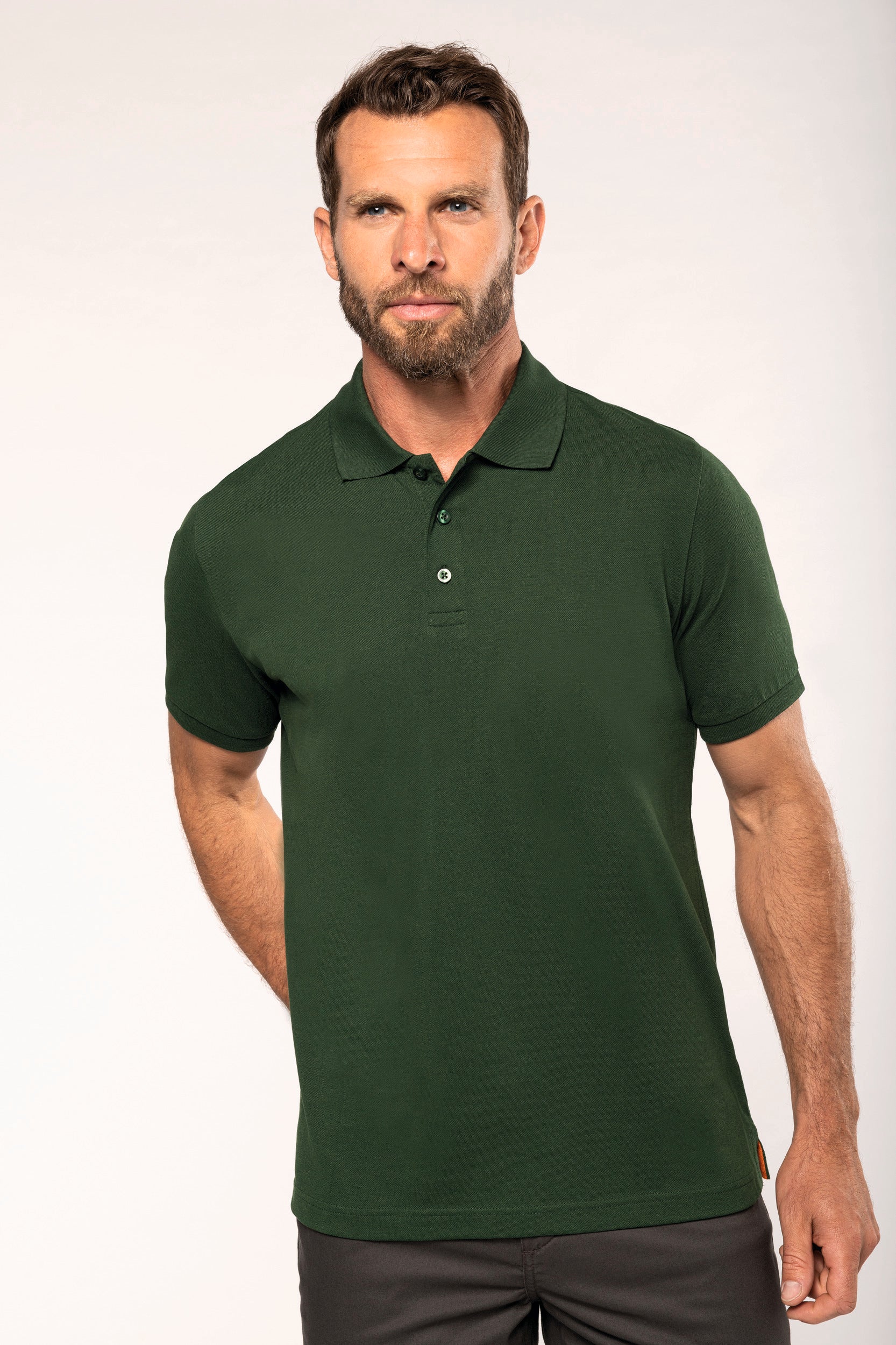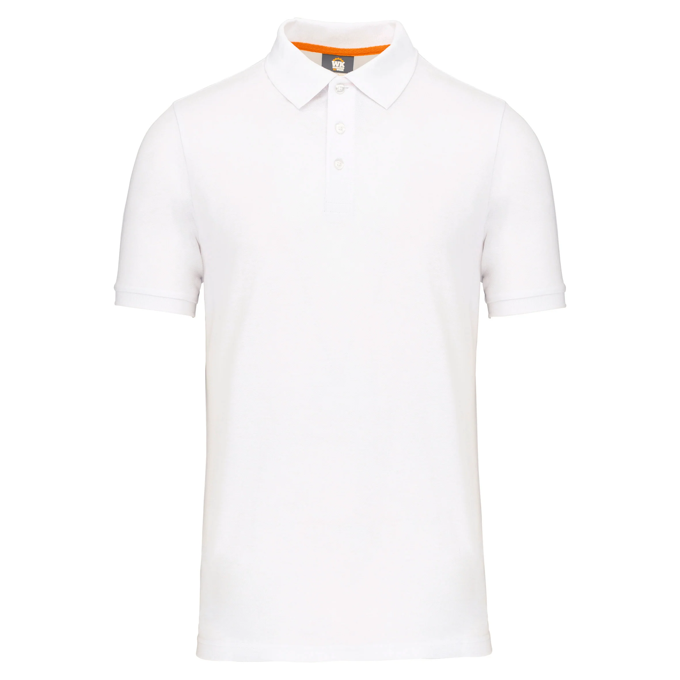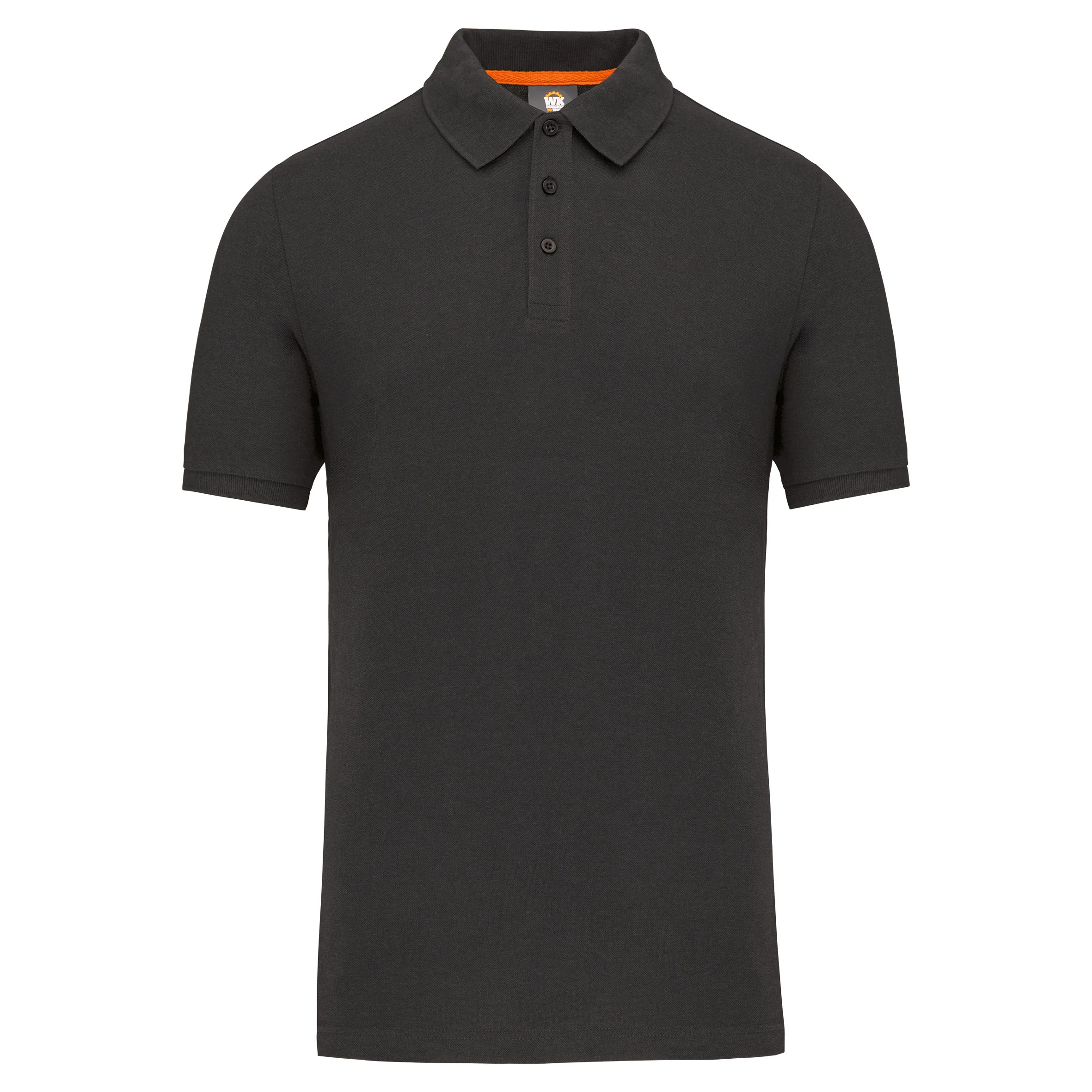 Tinta unita : 60% cotone biologico / 40% poliestere riciclato. Tinta Oxford Grey : 90% cotone biologico / 10% viscosa. Tessuto maglia piqué. Lavabile a 60°. Taglio dritto. Colletto e fondo manica a costine 1×1 con nastrino di rinforzo con motivo spigato a contrasto arancione. Pattina con 3 bottoni tono su tono. Prima asola orizzontale. Spacchetti laterali con nastrino a motivo spigato a contrasto arancione. Finitura a doppia impuntura a fondo capo. Etichetta con il nome del marchio staccabile, per semplificare la personalizzazione. Certificato STANDARD 100 by OEKO-TEX®N° CQ1007/7, IFTH.