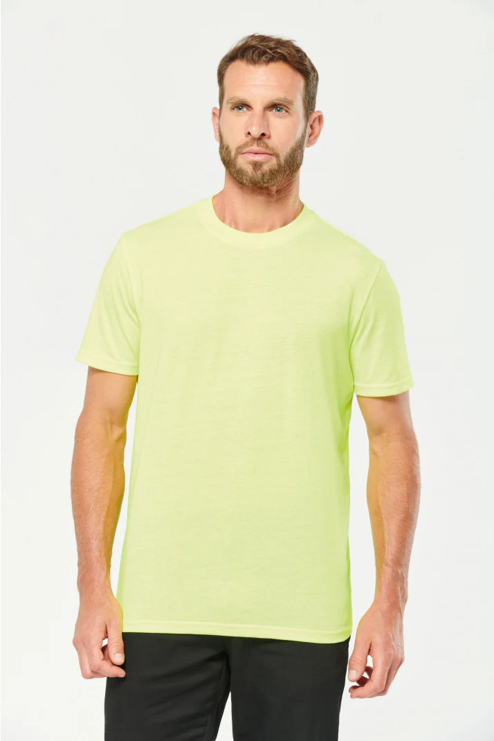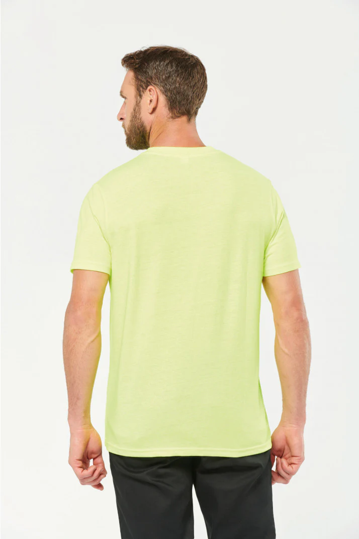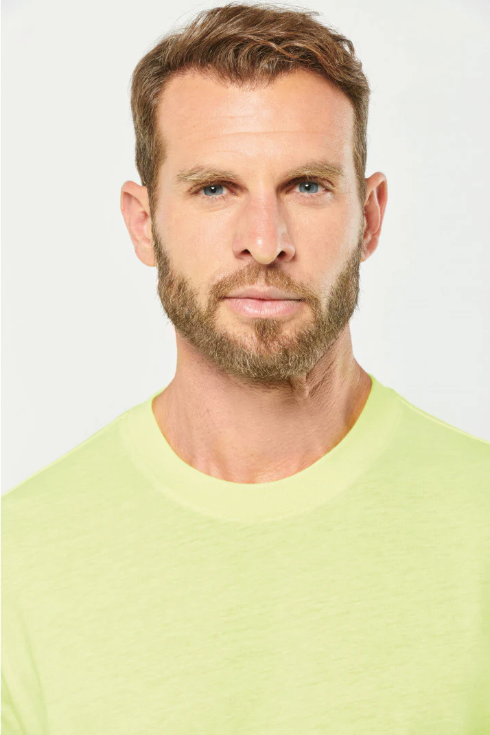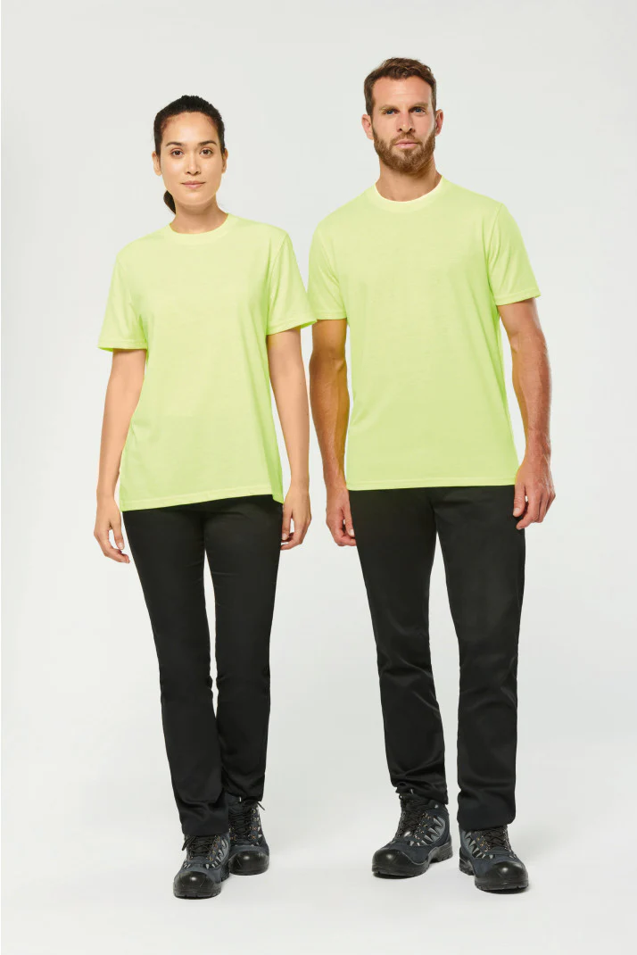 Tinta unita: 100% cotone biologico. Colori screziati: 92% cotone biologico / 8% poliestere. Colori fluorescenti: 65% poliestere riciclato / 35% cotone. Taglio dritto. Collo tondo a costine 2×1 con elastan e nastrino di rinforzo arancione sui colori in tinta unita e screziati tono su tono sui colori fluorescenti. Finitura a doppia impuntura a fondo maniche e fondo capo. Etichetta con il nome del marchio staccabile. Certificato STANDARD 100 by OEKO-TEX®N° CQ1007/7, IFTH.