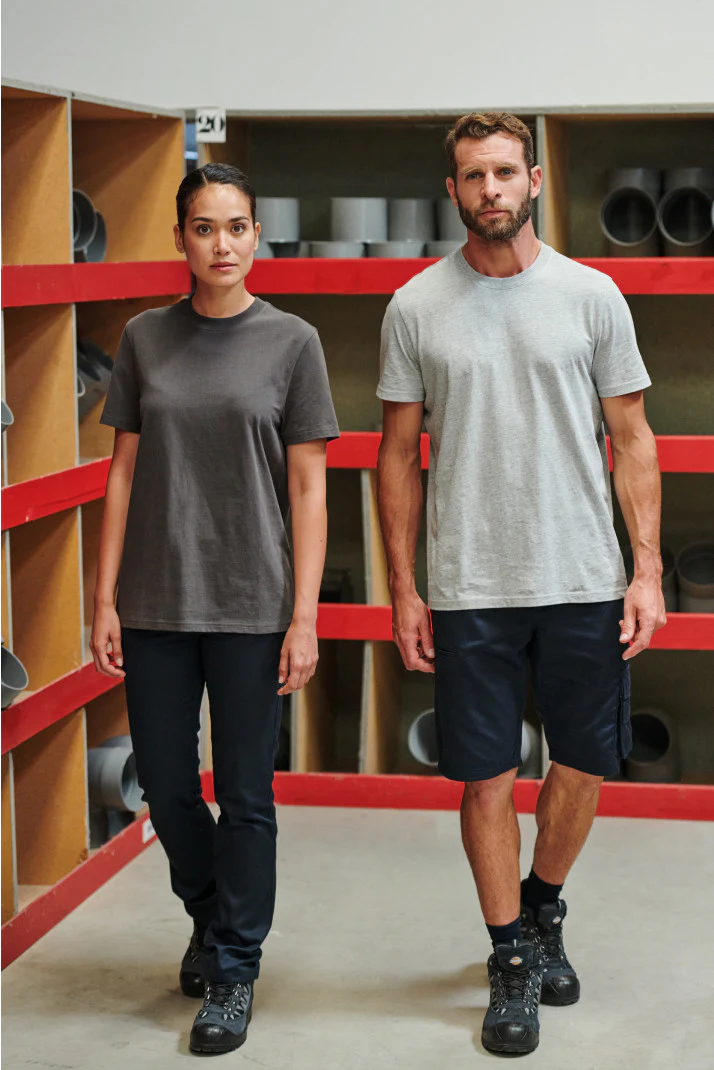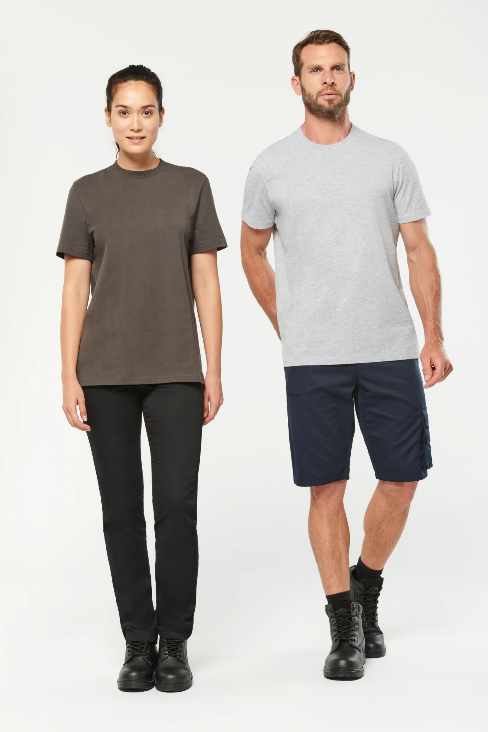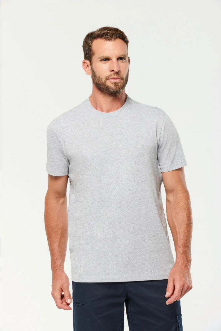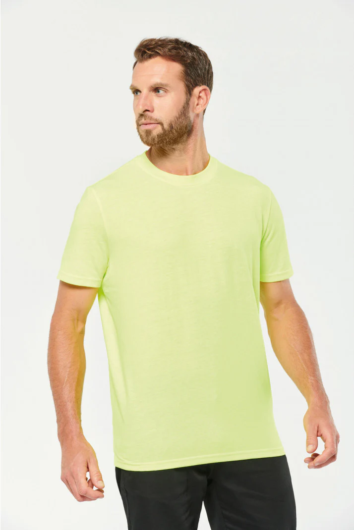 Tinta unita: 100% cotone biologico. Colori screziati: 92% cotone biologico / 8% poliestere. Colori fluorescenti: 65% poliestere riciclato / 35% cotone. Taglio dritto. Collo tondo a costine 2×1 con elastan e nastrino di rinforzo arancione sui colori in tinta unita e screziati tono su tono sui colori fluorescenti. Finitura a doppia impuntura a fondo maniche e fondo capo. Etichetta con il nome del marchio staccabile. Certificato STANDARD 100 by OEKO-TEX®N° CQ1007/7, IFTH.