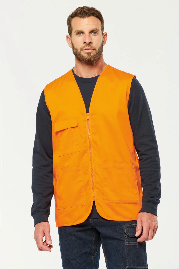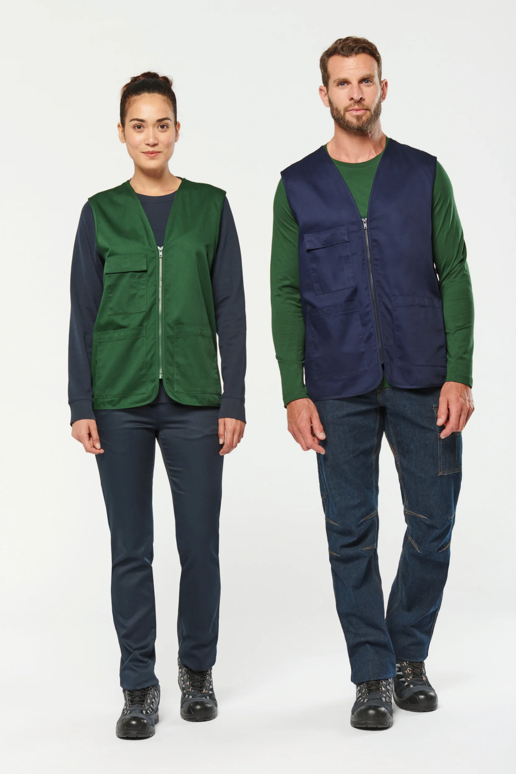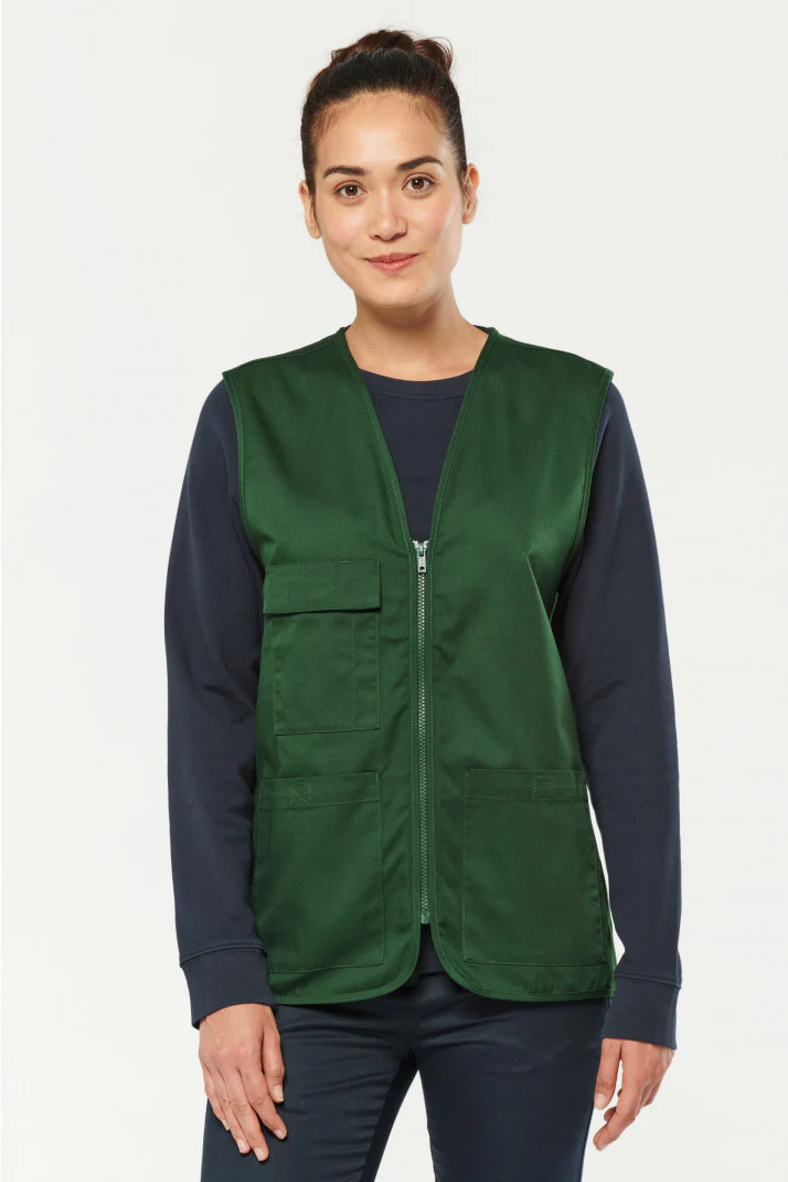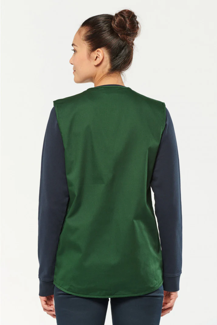 Esterno: 65% poliestere / 35% cotone. Taglio aderente. 2 ampie tasche a strappo applicate davanti + 1 tasca applicata sul petto con 1 scomparto porta penna. Chiusura con zip in plastica tono su tono. Asola all’interno del collo per appendere il capo. Parte posteriore leggermente più lunga. Finitura con sbieco tono su tono sul giromanica e sui bordi del capo. Etichetta con il nome all’interno del capo. Etichetta con il nome del marchio staccabile.