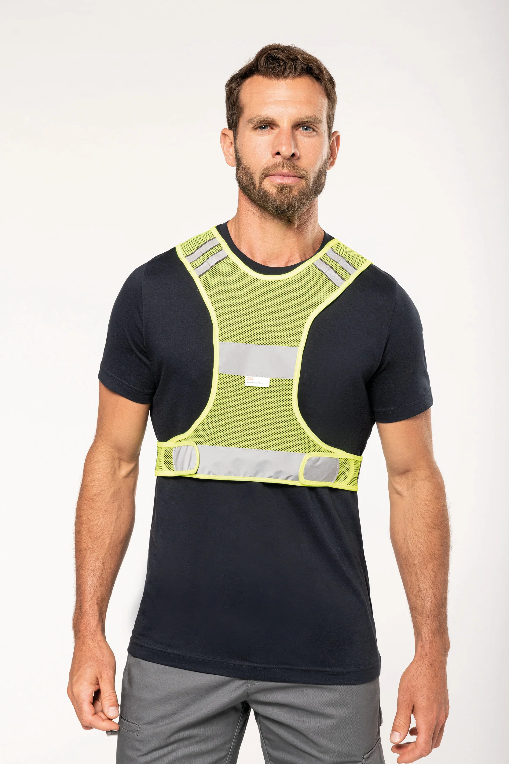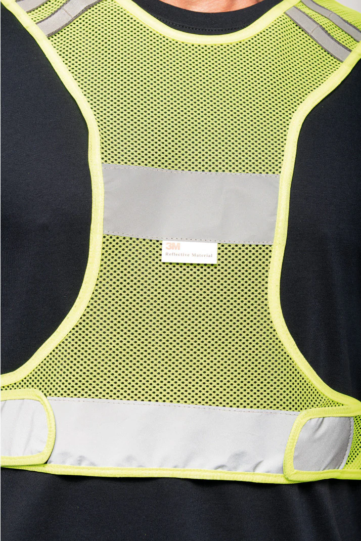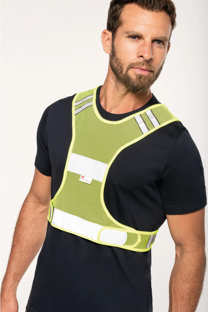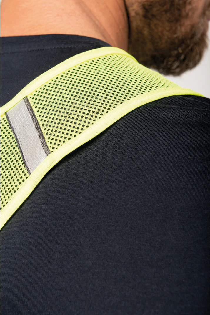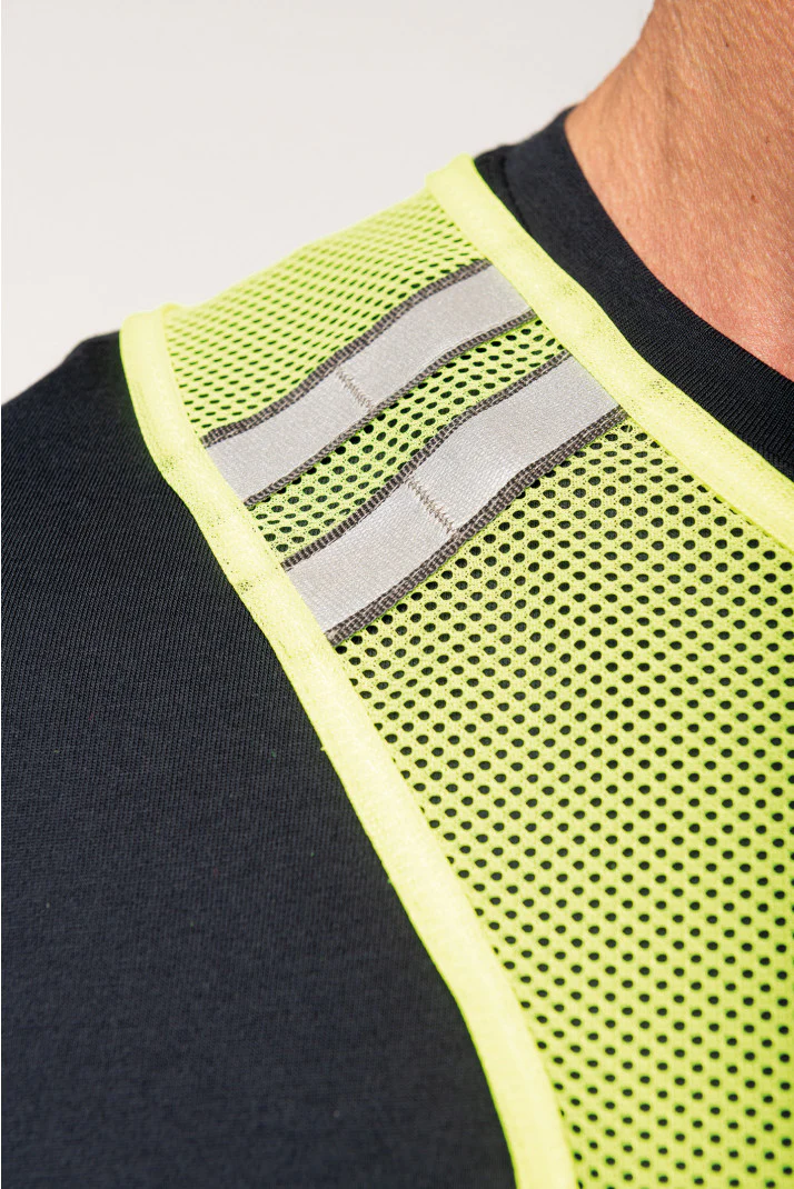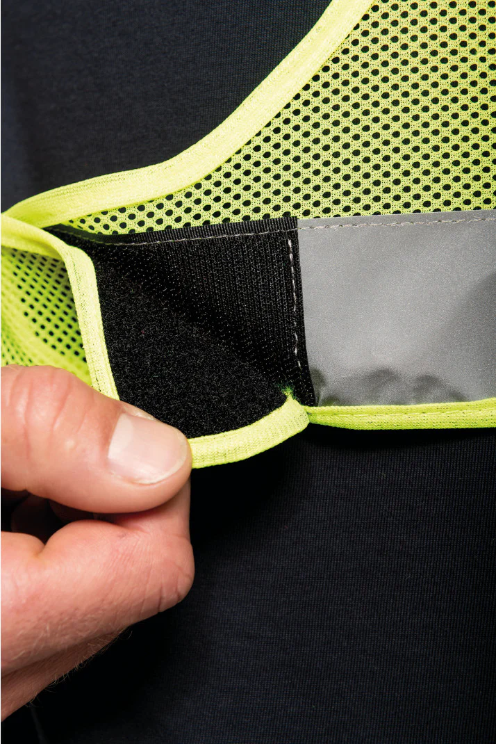 100% poliestere. Gilet micro-perforato traspirante fluorescente conforme alla norma EN 13356:2001, classe 2.Striscia riflettente in materiale 3M Scotchlite. Chiusura in velcro sui lati. Questo prodotto soddisfa i requisiti di prestazione ottica per gli accessori destinati ad essere indossati dalle persone e progettati per un uso non professionale.